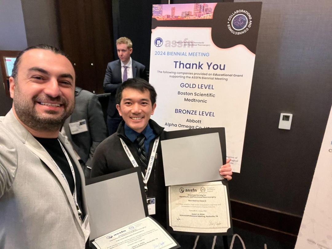 Postdoctoral scholars Kenneth Louie, PhD, and Hamid Fekri Azgomi, PhD, both received awards at the American Society for Stereotactic and Functional Neurosurgery (ASSFN) 2024 Conference. Fekri Azgomi won the Top Clinical Poster Presentation Award, and Louie won the Best Abstract Award.